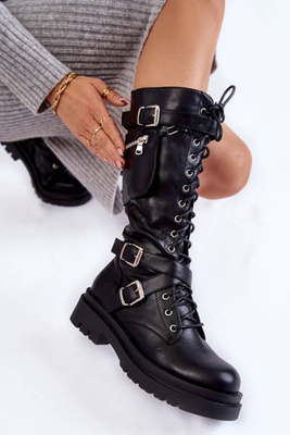 Lederstiefel Mit Flacher Absatz Schwarz Diominna