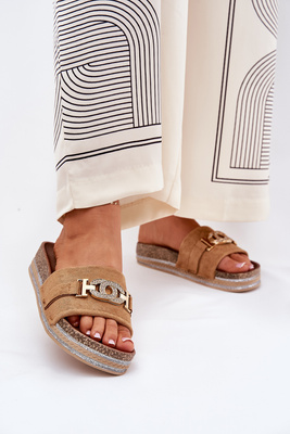 Damen Pantoletten Mit Goldenem Detail Auf Plattform Mit Glitzer Camel Eanes