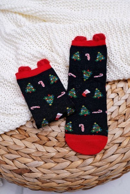 Women's Christmas Socks Black With Ears In Christmas Trees