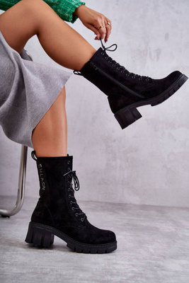 Women's Lace-up Suede Flat Heel Boots Black Firmina