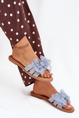 Women Flat Heel Slippers With Tulle Bow Denim Tanira