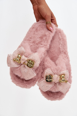 Furry Women's Slippers with Bow and Gold Decoration Pink Nolara