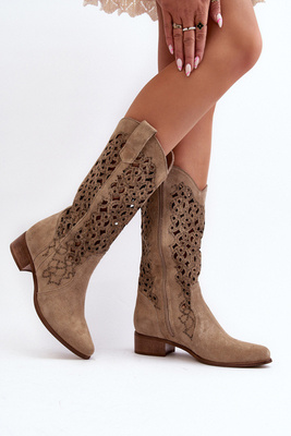 Zazoo 3403 Openwork Low Heel Women's Boots Beige