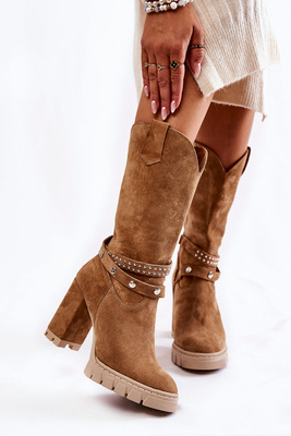 Suede Boots On High Heels With A Decorative Zipper Beige Lisette
