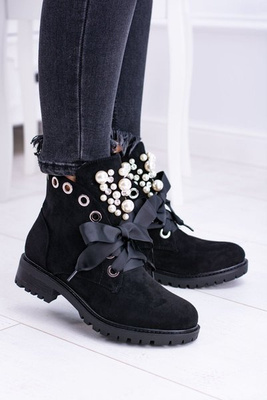 Bottines Doublées En Daim Avec Perles Et Ruban Black Perla