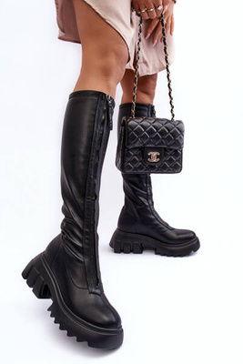 Bőr térdig érő csizma platformsarkú fekete Rorezena
