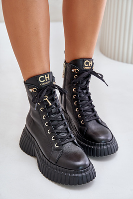 Bőr Bokapántos Csizmák Platformon Cipzárral És Dekoratív Zárral CheBello 4517 Fekete