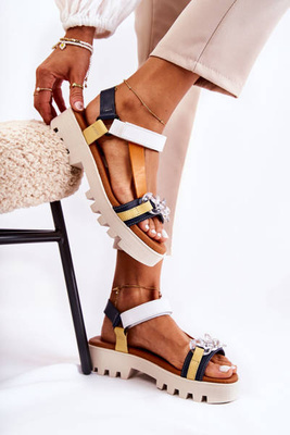 Madingi sandalai ant didžiulės smėlio spalvos Mariel platformos