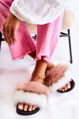+17Šlepetės su natūraliu kailiu Baltos ir rožinės spalvos Naturis