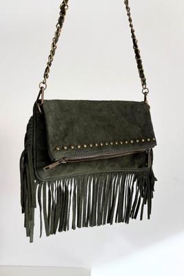 Aksominė rankinė su kutais ant grandinėlės tamsiai žalia Narella