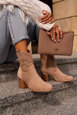 Botine preforate cu toc gros din piele ecologică închidere cu fermoar bej închis Sevana