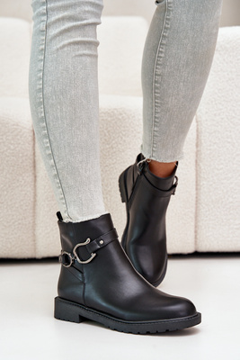 Botine Încălzite Cu Toc Plat Și Curea Decorativă Negre Calzina